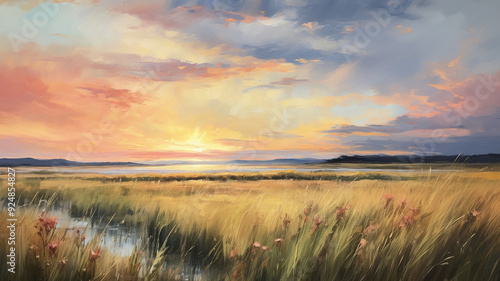 © huma, Obraz premium A peaceful bay with sailboats anchored as the sun sets, casting a warm glow on the water and coloring the sky in rich hues