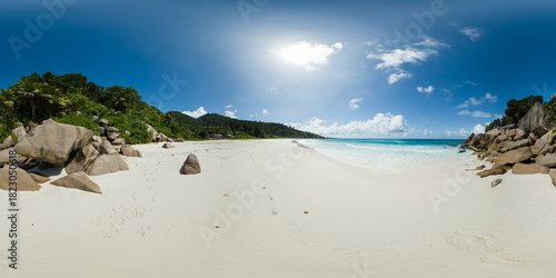 © Alex Traveler, Fototapeta premium A peaceful beach featuring soft white sand, large granite boulders, and vibrant greenery under a bright sky. Petite Anse Beach, La Digue, Seychelles. Virtual Reality 360.
