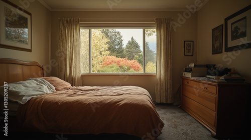 © Ilyass, Obraz premium A peaceful bedroom with a view of autumn foliage.