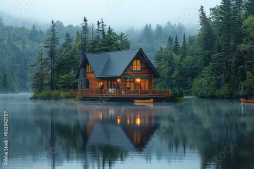 Fototapeta premium A peaceful Canadian lakeside cabin with a wooden deck, canoes, and towering...