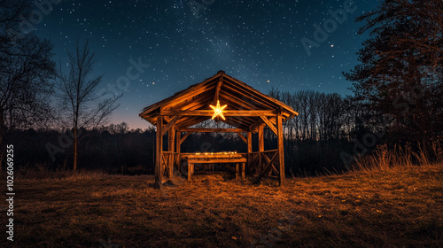 © Tahsin, Obraz premium A peaceful Christmas Eve setting with a wooden shelter under starlit sky in a natural landscape