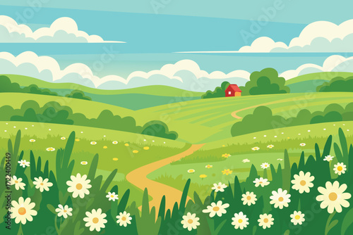 © MAYENUDDIN, Fototapeta premium A peaceful countryside landscape featuring a winding path and a small red house