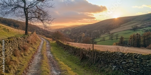 © phy, Fototapeta premium A peaceful countryside scene with the sun setting behind rolling hills