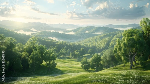 Fototapeta premium a peaceful countryside with rolling hills and soft sunlight, natural and relaxing