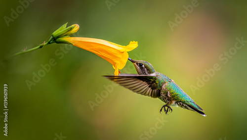 Fototapeta premium A peaceful dawn scene where a small hummingbird sips nectar from a flower,...