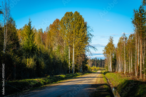 Fototapeta premium A peaceful dirt road winds through a forest in autumn, flanked by tall birch...