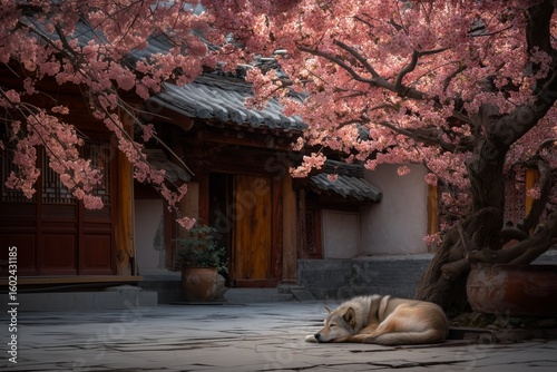 Fototapeta premium A peaceful dog sleeps under cherry blossoms in a quiet Zen garden