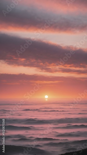 Naklejka premium A peaceful early morning sky at dawn with low-hanging, fluffy clouds in soft shades of pink and orange, the sun just starting to peek over the horizon