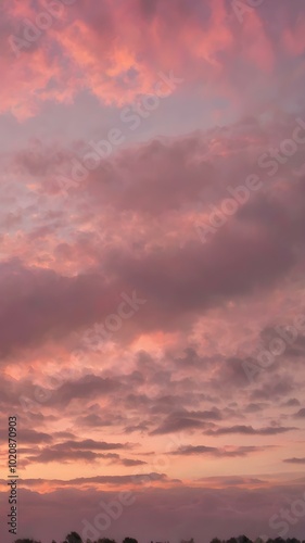 © LooPanda-Pictures, Naklejka premium A peaceful early morning sky at dawn with low-hanging, fluffy clouds in soft shades of pink and orange, the sun just starting to peek over the horizon