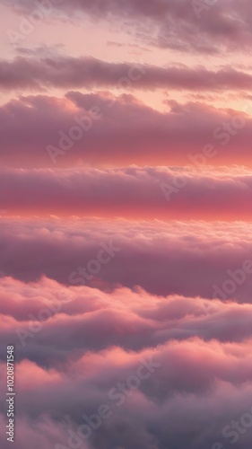 © LooPanda-Pictures, Fototapeta premium A peaceful early morning sky at dawn with low-hanging, fluffy clouds in soft shades of pink and orange, the sun just starting to peek over the horizon