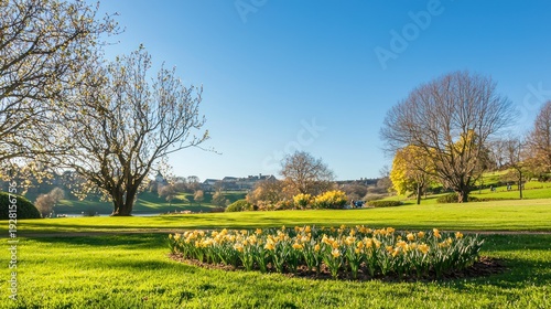 Fototapeta premium A peaceful early spring scene with flowers like crocuses and daffodils beginning to bloom under a clear blue sky.