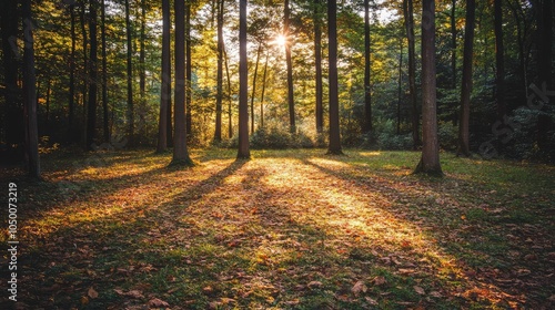 © Timeless Touch, Obraz premium A peaceful forest clearing with soft sunlight filtering through the trees, casting dappled shadows on the carpet of fallen leaves