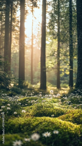 © Syahrul Zidane A, Obraz premium A peaceful forest floor covered in lush green moss and tiny wildflowers