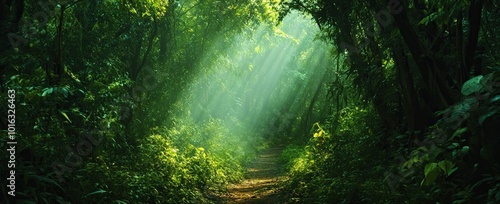 © Nld, Obraz premium A peaceful forest path beckons exploration through the lush greenery and sunlight