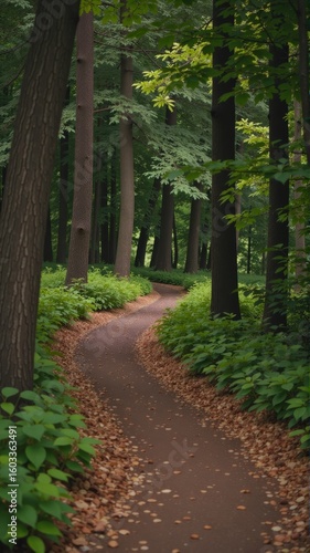 Fototapeta premium A peaceful forest path covered with fallen leaves, surrounded by tall green...