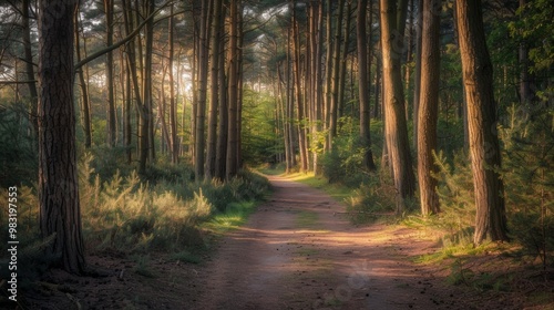 Obraz premium A peaceful forest path surrounded by tall trees and soft sunlight, inviting...