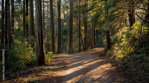 Obraz premium A peaceful forest path surrounded by tall trees with sunlight streaming through.