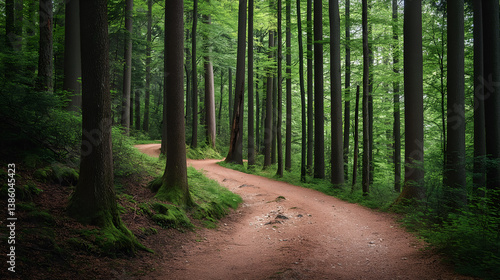 © Rattanapon, Obraz premium A peaceful forest path wilding through tall tree woods