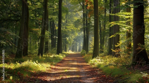 Obraz premium A peaceful forest pathway surrounded by tall trees, dappled sunlight dancing...