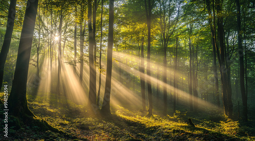© NE97, Naklejka premium A peaceful forest scene with sun rays shining through the trees, creating a serene and tranquil atmosphere. Suitable for nature-related content and environmental themes.