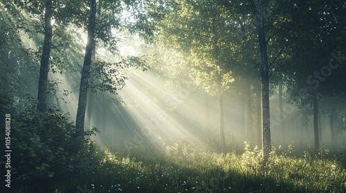 Obraz premium A peaceful forest scene with sunlight filtering through the mist, creating ethereal rays of light that dance through the trees
