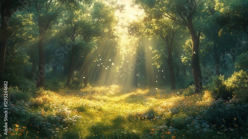 © Pathompong Thongsan, Obraz premium A peaceful forest scene with sunlight filtering through the trees, creating a magical atmosphere on the forest floor