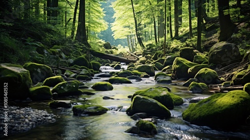 Obraz premium A peaceful forest stream with smooth stones and vibrant green plants