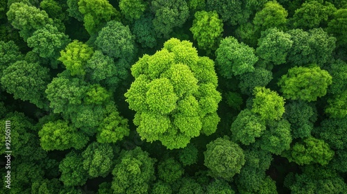 © songwut, Naklejka premium A peaceful forest, with carbon credits growing like leaves on trees, symbolizing natural carbon offsetting