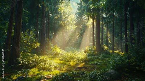 Fototapeta premium A peaceful forest with tall trees and soft sun rays illuminating the vibrant...