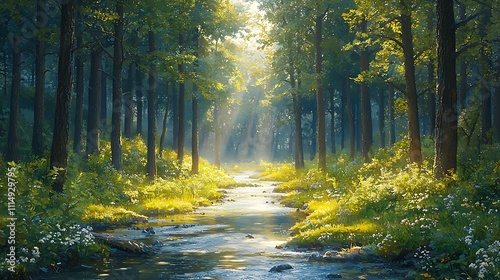 © tonpreecha, Obraz premium A peaceful forest with towering trees, sunlight streaming through the branches, and a river winding through the underbrush under a bright blue sky