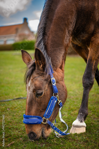 © Oksana, Obraz premium A peaceful horse grazes on a vibrant green meadow under the warm sun. The idyllic countryside setting exudes tranquility, with bright natural colors and a serene atmosphere.