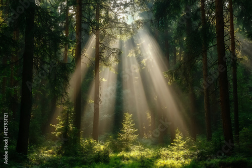 © Sung Hwan Kim, Fototapeta premium A peaceful image of a dense forest with rays