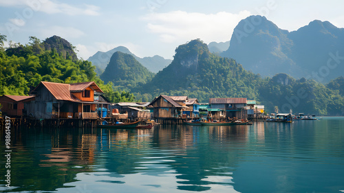 © Jamie, Naklejka premium A peaceful island village with stilt houses built over the water surrounded by mountains.