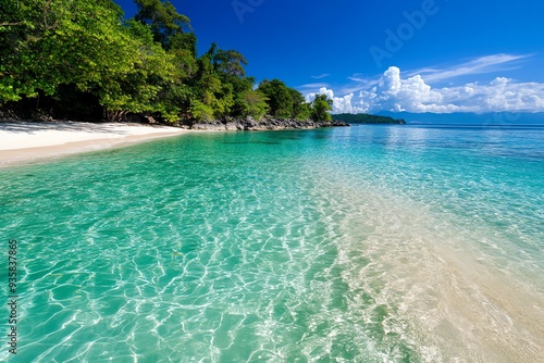 Fototapeta premium A peaceful, isolated beach on a paradise island, with crystal-clear water and white sand, perfect for a day of relaxation and solitude