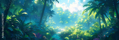 Fototapeta premium A peaceful jungle trail winding through tropical foliage, with orchids, palm trees, sunlight streaming through the canopy, and a tranquil stream, offering a serene and calming atmosphere, banner
