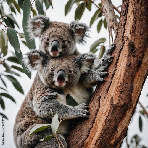 © Pakhtoon, Obraz premium A peaceful koala family clinging to a tree on a white background.