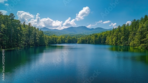 Fototapeta premium A peaceful lake surrounded by mountains and forest, creating a serene and tranquil landscape, ideal for relaxation, meditation, and nature-based projects that emphasize environmental beauty.