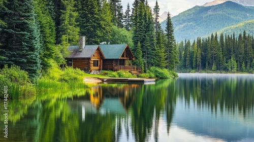 Fototapeta premium A peaceful lakeside cabin nestled among tall evergreens, with a dock...