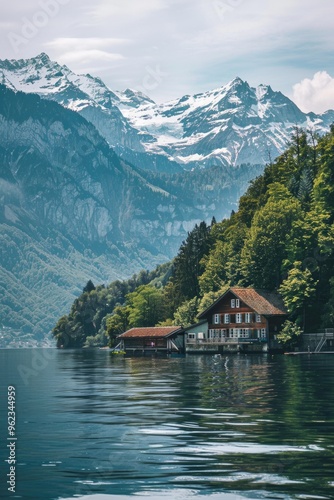 Fototapeta premium A peaceful lakeside residence with mountains in the background, suitable for...