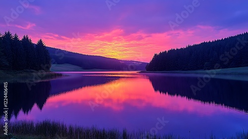 © Nosheen, Fototapeta premium A peaceful lakeside view with clear water, surrounded by dense pine trees under a colorful sunset.