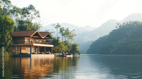 © Phoophinyo, Naklejka premium A peaceful lakeside wellness center in Asia, where travelers focus on detox and rejuvenation through meditation, organic nutrition, and outdoor activities like kayaking