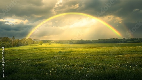 Naklejka premium 130.A peaceful landscape of rolling green meadows, framed by a soft rainbow arching across the horizon, with sunlight streaming through the clouds, creating a serene, post-rain mood.