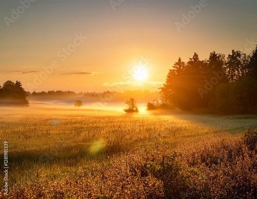 © Joseph, Obraz premium a peaceful landscape with the golden glow of the sun rising over a misty field