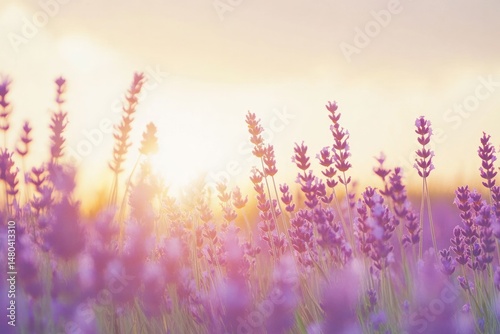 © Putt_Sanplee, Naklejka premium A peaceful lavender field bathed in the soft light of a setting sun, creating a gentle gradient of colors from gold to purple in the sky. The field stretches across the frame