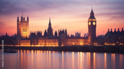 Fototapeta premium A peaceful London evening scene shows Big Ben and Parliament lit up at dusk.