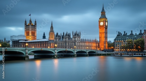 © Elkhan Babayev, Obraz premium A peaceful London evening scene shows Big Ben and Parliament lit up at dusk.