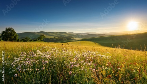 Fototapeta premium A peaceful meadow dotted with wildflowers, bathed in golden sunlight with distant rolling hills and a clear blue sky overhead.