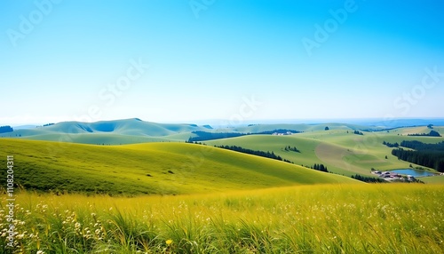© TheseusStock, Obraz premium "A peaceful meadow wallpaper symbolizing the earth element, with rolling hills and a clear blue sky."