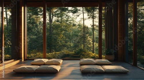 © Pannee, Obraz premium A peaceful meditation corner with floor cushions and natural wood decor.