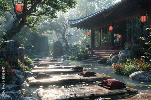 Obraz premium A peaceful meditation retreat set amidst tranquil forest surroundings, where...